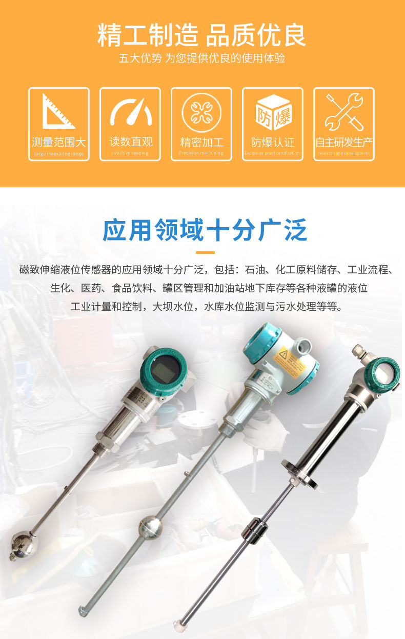 3.安全性好:磁致伸縮液位計(jì)的防爆性能高,本安防爆,使用安全,特別適合對化工原料和易燃液體的測量。測量時(shí)無需開啟罐蓋,避免人工測量所存在的不安全性。