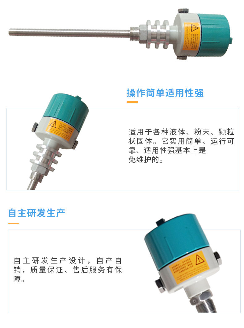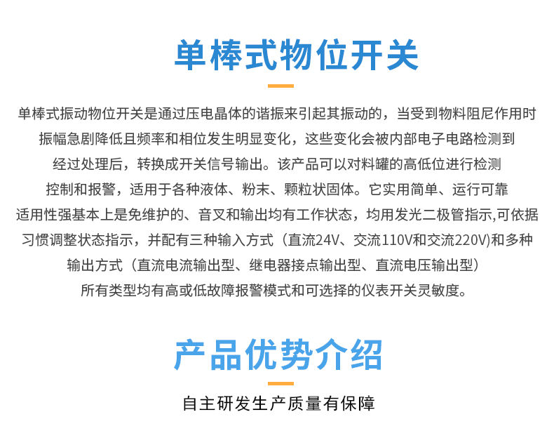 單棒式振動物位開關(guān)是通過壓電晶體的諧振來引起其振動的,當(dāng)受到物料阻尼作用時(shí),振幅急劇降低且頻率和相位發(fā)生明顯變化,這些變化會被內(nèi)部電子電路檢測到,經(jīng)過處理后,轉(zhuǎn)換成開關(guān)信號輸出。該產(chǎn)品可以對料罐的高低位進(jìn)行檢測、控制和報(bào)警,適用于各種液體、粉末、顆粒狀固體。它實(shí)用簡單、運(yùn)行可靠、適用性強(qiáng)基本上是免維護(hù)的、音叉和輸出均有工作狀態(tài),均用發(fā)光二極管指示,可依據(jù)習(xí)慣調(diào)整狀態(tài)指示,并配有三種輸入方式(直流24V、交流110V和交流220V)和多種輸出方式(直流電流輸出型、繼電器接點(diǎn)輸出型、直流電壓輸出型)。所有類型均有高或低故障報(bào)警模式和可選擇的儀表開關(guān)靈敏度。