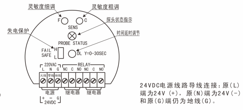 B).直流電源類(lèi)(24VD.C)24VD.C電源線(xiàn)路導(dǎo)線(xiàn)連接:原(L)端為-24V(+),原(N)端為公共端(-)和原(G)端仍為地線(xiàn)(G)。注意:必須良好接地