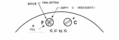 A).對(duì)于一個(gè)沒(méi)有水的空容器,調(diào)節(jié)細(xì)(F)靈敏度控制到中間位置,然后慢慢調(diào)節(jié)粗(C)靈敏度直到狀態(tài)指示燈剛剛變紅。重調(diào)細(xì)(F)靈敏度控制線(xiàn)找到一個(gè)剛剛變紅點(diǎn),記下“空”的位置。然后,將探頭插入物料重調(diào)細(xì)(F)靈敏度控制(不接觸粗調(diào)靈敏度)剛好變?yōu)榫G點(diǎn),并記下它的位置。注意兩個(gè)記號(hào)的不同,并且重調(diào)細(xì)(F)靈敏度控制到兩個(gè)記號(hào)的中間位置。這就是一個(gè)完整的調(diào)試過(guò)程。對(duì)于非水基工藝液體(不導(dǎo)電液體)最好的安裝方法是垂直安裝,當(dāng)液體到達(dá)一半時(shí)報(bào)警。
