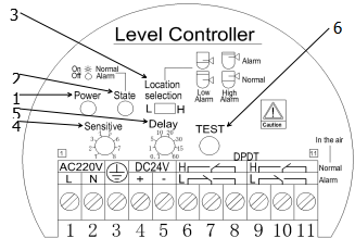 儀表接線如圖,1、2端子220VAC電源,4、5端子24VDC電源,選一組電源接線。3端子大地,6、7、8端子和9、10、11端子為兩組繼電器DPDT輸出。定制產(chǎn)品詳見面板標(biāo)識(shí)。 1、電源指示燈(綠):電源指示 2、狀態(tài)指示燈(紅):繼電器狀態(tài) 3、高低報(bào)警設(shè)置開關(guān):高低報(bào)警切換 4、靈敏度調(diào)節(jié):調(diào)節(jié)報(bào)警的靈敏度 5、延遲調(diào)節(jié):報(bào)警狀態(tài)的延時(shí)時(shí)間調(diào)節(jié)